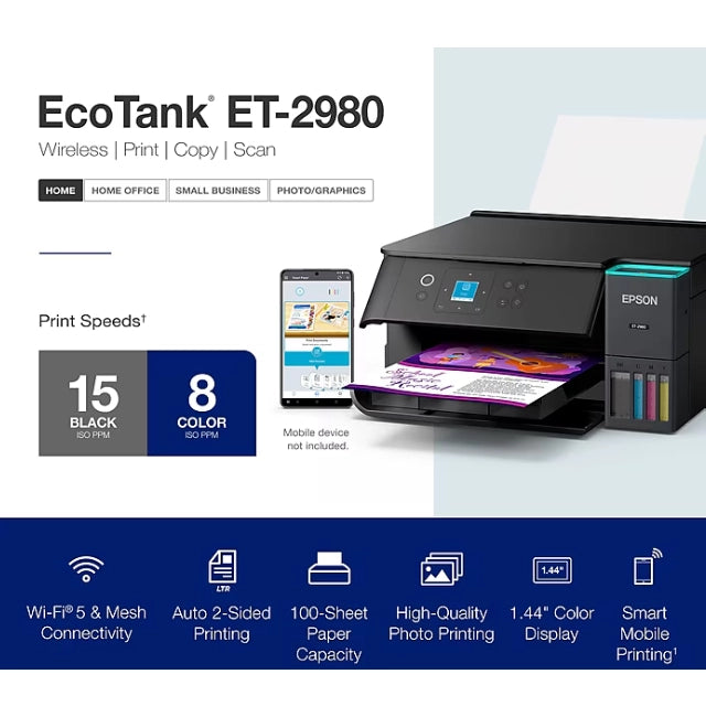 Introducing the EcoTank ET-2980—The Perfect Family Printer. Say goodbye to expensive cartridges with the Epson EcoTank ET-2980. Combining simplicity with a modern design, the ET-2980 features advanced technology that enhances both performance and print quality, making it an ideal choice for everyday family printing. Powered by PrecisionCore Heat-Free technology, the ET-2980 delivers print speeds 50% faster than its predecessor. And unlike conventional thermal inkjet printers, its unique permanent printhead is engineered to last the life of the printer. Designed to be simple and error-free, refilling ink is a breeze with large ink tanks and uniquely keyed EcoFit bottles that help prevent ink from drying out. And with enough ink included to last up to three years, you'll enjoy affordable color printing without the hassle of frequently replacing cartridges. Featuring built-in USB and Wi-Fi for seamless connectivity, along with the user-friendly Epson Smart Panel app, you can easily print, scan, and more directly from your computer or mobile device.