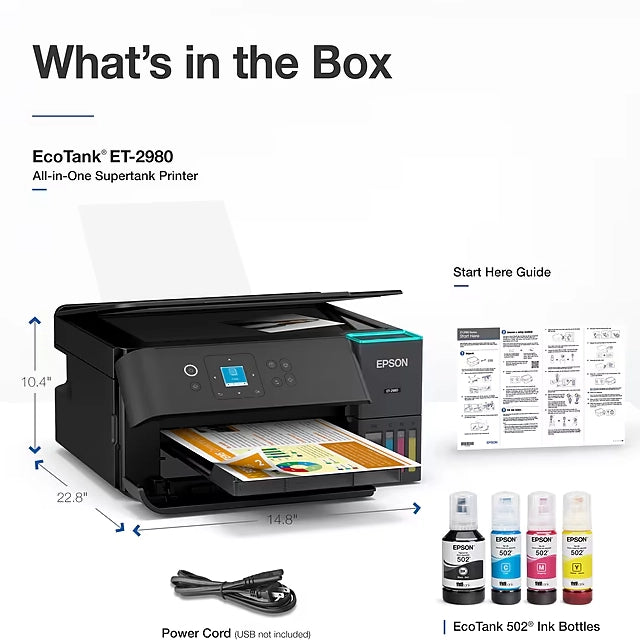 What's in the Printer Box: EcoTank ET-2980 all-in-one, manual, power cord, 1 bottle of 502 Black (127 mL) and 1 bottle each of 502 Cyan, Magenta, Yellow (70 mL);Â