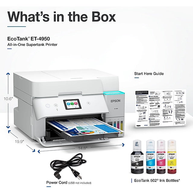 What's in the Printer Box: EcoTank ET-4950 all-in-one, manual, power cord, 1 bottle of 502 Black (127 mL) and 1 bottle each of 502 Cyan, Magenta, Yellow (70 mL);Â