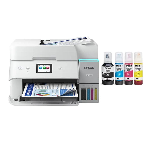 The ET-4950 features advanced technology that enhances both performance and print quality, making it an ideal choice for productive office printing—including content created by AI. Powered by PrecisionCore Heat-Free technology, the ET-4950 offers a duty cycle that's twice as robust as its predecessor. And its unique permanent printhead is engineered to last the life of the printer. Designed to be simple and error-free, refilling ink is a breeze with large ink tanks and uniquely keyed EcoFit bottles. With enough ink in the box to last up to three years, you'll enjoy affordable, worry-free color printing without the hassle of frequently replacing cartridges.Â